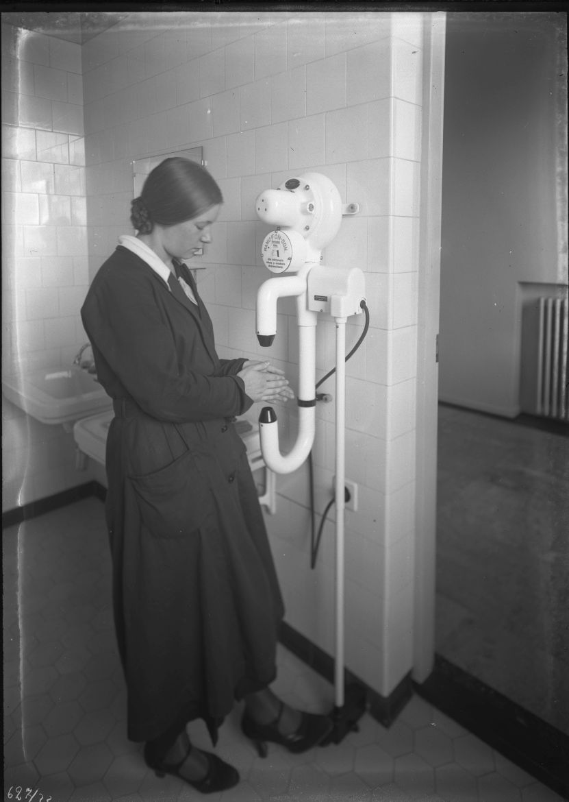 Uusi terveydenhoitolaki kinnitti huomiota muun muassa hygieniaan. Osuustukkukaupan (OTK:n) työntekijä sähköisen käsienkuivaajan luona vuonna 1933. Kuvaaja Eino Finne. Työväenmuseo Werstas.
