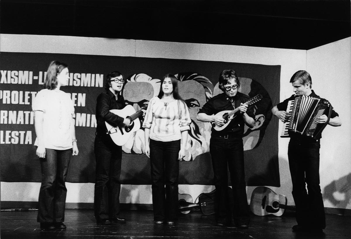 Agit-Propin Kisällit esiintymässä Sosialistisen Opiskelijaliiton juhlaistunnossa 1970-luvulla. Kansan Arkisto.